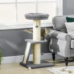 PawHut Arbre à Chat Griffoir Grattoir Design Jeu Boule Suspendue 2 Plateformes Peluche Sisal Naturel Gris – Gris