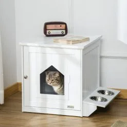 PawHut Maison De Toilette Pour Chat Design Porte Forme Maisonnette – Porte 2 Gamelles Intégré – Dim. 64L X 51l X 51,8H Cm – MDF Blanc