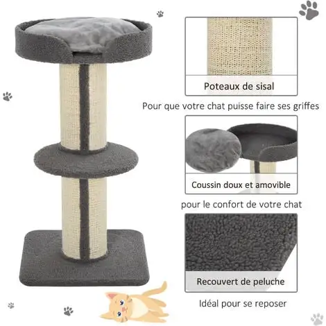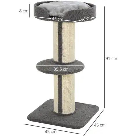 Ce centre multi-activités comprend des griffoirs recouverts de sisal naturel et des perchoirs confortables. Le grattoir pour chats profite à la fois à l’animal et à son propriétaire en offrant un endroit où les chats peuvent faire leurs griffes et grimper et en protégeant vos tapis et vos meubles de maison des dégâts. Repos, jeu, exercice, vos chats peuvent y passer toute la journée, une unité confortable pour eux. Caractéristiques : – Recouvert de peluche douce et d’un coussin moelleux fourni, vos chats adoreront ce toucher félin et se reposeront dessus pendant des heures sans fin – Perchoirs avec bord relevé offre un espace confortable pour la détente de vos chats – Poteaux en sisal naturel satisfont la nature des griffes de vos chats et protègent vos meubles des griffes – Fabriqué en panneau de MDF de classe E1 de haute qualité, écologique et ne nuit pas à la santé de vos chats – Élégant ton gris s’intègrent facilement dans le décor chez vous – Montage facile Spécifications : – Couleur : gris – Matériaux : panneaux de particules classe E1, cachemire simple face, sisal naturel – Dim. totales : 45L x 45I x 91H cm – Dim. plateforme supérieur : 45L x 36I x 8H cm – Diamètre plateforme intermédiaire : 35,5 cm – Dim. base : 45L x 45I cm – Diamètre poteau : 16,5 cm – Charge max. recommandée : 30 Kg – Livraison effectuée en un colis – Réf. : D30-269GY