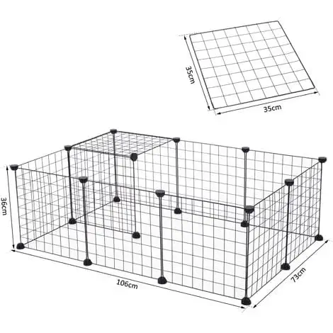 Cette cage pour animaux domestiques est l’accessoire idéal pour permettre à vos petits compagnons de s’amuser confortablement et en toute sécurité. Ce modèle est spécialement conçu pour les animaux de petite taille tels que les cobayes, les lapins ou les cochons d’Inde. Montez cet enclos pour animaux domestiques selon vos envies ou en fonction de la configuration de la pièce grâce aux connecteurs multi-angles. La structure en fil métallique avec bords arrondis est un gage de solidité tout en évitant aux animaux de se blesser. Pratique, cet article peut également être utilisé en tant qu’étagère ou rangement de chaussures.