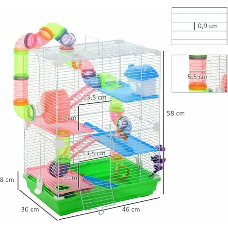 Cette superbe cage pour hamsters, souris ou autres petits rongeurs offrira un habitat et espace de jeu idéal pour votre ou vos petits animaux. Fabriqué en acier et PVC, dotée de nombreux accessoires (4 étages, 4 échelles, tunnels, maisonnette, roue d’exercice, biberon d’eau, etc…), vos rongeurs pourront se défouler à volonté ! Caractéristiques : – Cage destinée aux hamsters, souris ou autres petits rongeurs – Multi-équipements de jeu pour vos rongeurs : 4 échelles, tunnels, maisonnette, roue d’exercice, biberon d’eau, etc… – Cage à plusieurs étages (4 étages) offrant un bel espace à votre petit animal pour jouer, grimper, se reposer et manger – Conçue et fabriquée à partir des matériaux robustes (acier et PVC) pour un usage pérenne – 2 portes avant pour un accès facile – Tous les accessoire sont amovibles – Montage facile, rapide à l’aide du manuel d’assemblage illustré fourni Spécifications : – Couleur principale : vert – Matériaux principaux : métal, PP, PS – Dim. totales : 46L x 30I x 58H cm – Dim. plateau inférieur : 46L x 30I x 8H cm – Dim. porte : 13,5I x 9H cm – Dim. plateforme : 28L x 15,5I cm – Dim. maisonnette : 15L x 9I x 9H cm – Dim. porte de la maisonnette : 4I x 4,5H cm – Dim. échelle : 22.5L x 6I cm – Dim. roue d’exercice : Ø 13 x 8 cm – Dim. mangeoire : Ø 8 x 4H cm – Ø tuyau droit/coudé : 5,5 cm – Biberon d’eau : 80 ml – Livraison éffectuée dans un colis – Réf. : D51-214