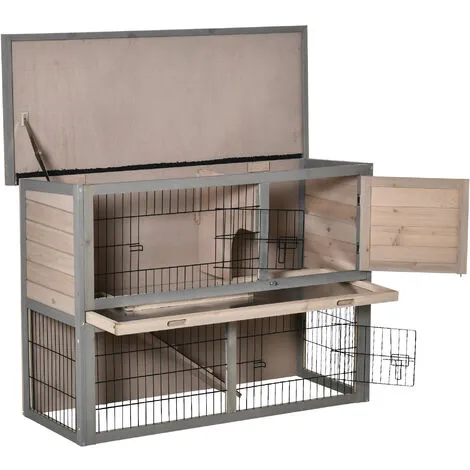 Ce magnifique clapier à lapin dispose d’un espace généreux sur 2 étages idéal pour que vos lapins grandissent en toute sérénité tout confort ! Equipé d’une rampe, d’un toit bitûmé, d’un espace jardin clos et d’un espace intérieur (total de 3 portes verrouillables), ce sera un plaisir de voir évoluer et s’épanouir vos lapins ! Caractéristiques : – Clapier à lapin 2 niveaux bicolore gris clair gris foncé très élégant – Offrez un espace de vie agréable pour le plus grand confort de votre/vos lapin(s) : niche fermée superposée pour être à l’abri de la pluie, du vent, de l’humidité – Nombreux équipements : niche, toit bitûmé, rampe d’accès, 3 portes avec verrous de sécurité, etc. – Toit bitumé pour plus d’imperméabilité et une meilleure protection face aux oiseaux, insectes, etc. – 3 portes, toit ouvrant, tiroir à dejection coulissant afin de vous faciliter l’entretien de votre clapier : hygiène et bien-être optimum de vos lapins – Clôture grillagée avec maillage durable (fil de fer époxy anticorrosion) : aération optimale, visibilité permanente sur vos animaux – Conception et fabrication avec des matériaux de qualité (bois de sapin pré-huilé), durée de vie pérenne – Capacité d’accueil de 1 ou 2 lapins – Convient aussi pour les cochons d’inde, Chinchilla, poulets et autres animaux Spécifications : – Couleurs principale : gris foncé, gris clair – Matériaux principaux : bois de sapin, fer – Dim. totales : 108L x 45l x 78H cm – Dim. niche : 98,5L x 37,5l x 43H cm – Dim. porte bois : 32,5l x 29,3H cm – Dim. porte grillagée : 56l x 29,8H cm – Dim. rampe d’accès : 61L x 15l cm – Dim. aire de jeu : 102L x 40l x 36H cm – Dim. tiroir déjection : 98L x 38,5l cm – Livraison effectuée en un colis – Réf. : D51-118V01CG