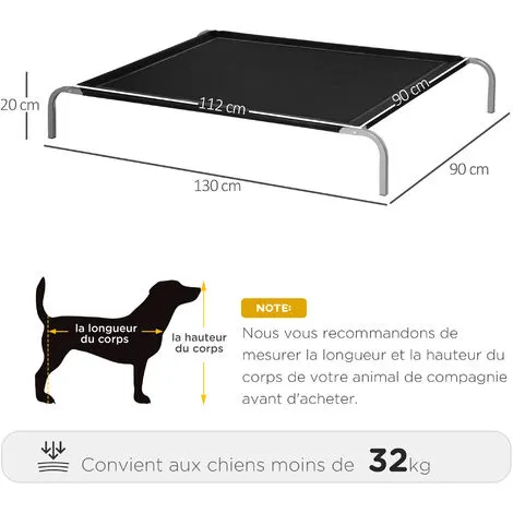 Ce joli lit sur pied bicolore gris clair noir apportera un confort inégalé à votre chien même pendant les fortes chaleurs de l’été ! Sa conception et fabrication sur pied avec revêtement de dernière génération en textilène haute densité 430 g/m² micro-perforé permettra à votre animal de compagnie de se reposer au frais même pendant les fortes chaleurs de l’été. Caractéristiques : – Lit XXL sur pied pour chien chat idéal pour une utilisation intérieure ou extérieure (terrasse, jardin) – Revêtement de dernière génération en textilène haute densité 430 g/m² micro-perforé pour une excellente ventilation et le bien-être de votre animal même par forte chaleur – Châssis en métal époxy anticorrosion robuste pour un usage pérenne en toute sécurité – Lit sur pieds surélevé idéal pour tenir votre chien à l’écart de l’humidité éventuelle du sol et des insectes : confort optimal de repos pour votre animal – Patins antidérapants installés sous chaque pied : stabilité optimisée même si utilisation sur du parquet ou carrelage, aucun risque de rayure de votre sol Spécifications : – Matériaux principaux : métal époxy anticorrosion, textilène – Couleurs : noir, gris – Dim. totales : 130L x 90l x 20H cm – Dim. surface de couchage : 112L x 90l cm – Hauteur du lit : 20 cm – Charge max. recommandée de 32 Kg – Livraison effectuée en un colis – Réf. : D04-064V03BK