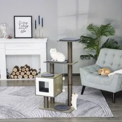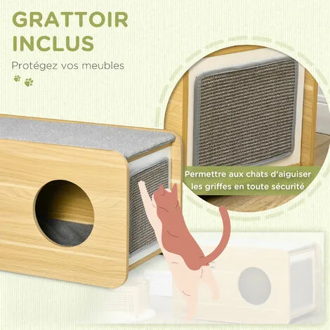 – Couleurs principales : aspect bois clair, gris (coussins, grattoir)