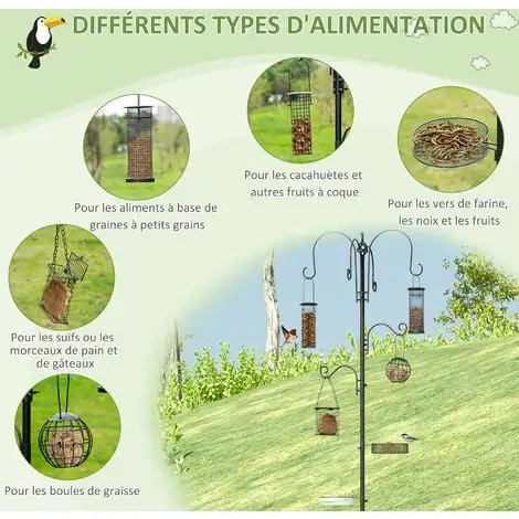 – Equipé de 6 crochets réglables, de 4 mangeoires (à graines, à cacahuètes, etc.), d’un plateau d’alimentation et d’un grand bain pour attirer de nombreuses variétés d’oiseaux à venir s’y poser