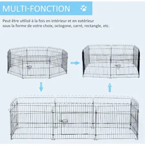 Ce parc enclos convient à tous types d’animaux de compagnie tels les chiens, les chats, les lapins, etc… Doté de 8 panneaux, vous pourrez modifier sa configuration à votre guise suivant les préférences de vos animaux. Équipé d’une porte avec système de verrouillage, vos animaux profiterons d’un espace adaptable et entièrement sécurisé !