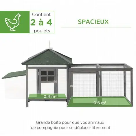 Ce poulailler cottage multi-équipé Pawhut permettra à vos poules de se développer très confortablement afin d’obtenir le meilleur rendement de ponte possible ! Conçu et fabriqué en bois massif de pin, vos poules pourront grandir en tout confort toute sécurité grâce à l’équipement portes, pondoir, aire de jeu, niche, etc. De quoi satisfaire les éleveurs les plus exigeants !