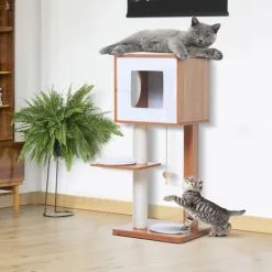 PawHut Arbre à Chats Design Contemporain Griffoir Grattoir Sisal Naturel Niche Plate-forme Jeu Boule Suspendue 50L X 40l X 91H Cm MDF Hêtre – Beige